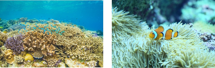 ダイビングはもちろん各種マリンスポーツも充実しています。浅瀬にはカラフルなサンゴ礁、クマノミなどのトロピカルフィッシュを見ることができインスタ映え間違えなし!!