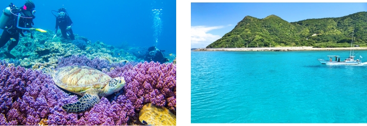 透明度の高い「ケラマブルー」が魅力的。サンゴ礁はもちろんカメを見れる確率が高く冬はザトウクジラをみるフォエールウォッチングが人気です。